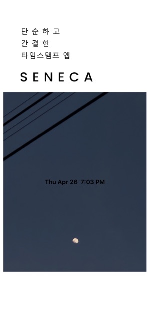 순간을 기록하는 프리미엄 타임스탬프 카메라, SENECA를 소개합니다.주요 기능:- 고품질 타임스탬프 사진 촬영- 다양한 폰트 스타일과 색상 선택- 자유로운 타임스탬프 위치 조정- 갤러리에서 사진 선택 후 타임스탬프 추가- 실시간 카메라 화면 비율 조정- 전/후면 카메라 전환- 자동 초점 및 줌 컨트롤SENECA만의 특별함:- 직관적이고 세련된 사용자 인터페이스- 빠른 이미지 처리 속도- 최적화된 앱 성능- 안정적인 카메라 기능비즈니스, 여행, 일상의 순간까지 - SENECA와 함께 소중한 순간을 타임스탬프와 함께 기록하세요.* 최적의 경험을 위해 iOS 최신 버전 사용을 권장합니다.