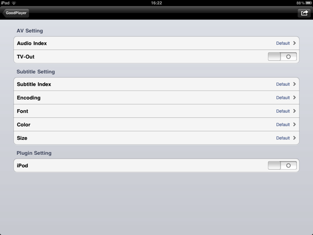 AVI,Xvid,DAT,VOB,FLV,WMV,MKV,MP4,RM,RMVB,HTTP, FTP,RTSP,MMS,SMB,MMSH,MMST,RTP,UPnP과UDP매체파일과 스트림 미디어파일에 대해 GoodPlayer는 미디어파일을 전화하지 안해도 플레이 가능함.iTunes파일 공유 혹은Wi-Fi로 미디어파일을 iOS설비에 전송하면 바로 플레이 가능함.내장형 브라우저의 도움으로 GoodPlayer는 로컬미디어플레이어뿐만 아니라 사실 비디오 펄레이어&스트림 미디어 플레이어이다.그러고GoodPlayer는iPad 2/iPhone 4S A5 CPU의 듀얼코어해독기를 지지한다.iPhone 최우수 비디오 플레이어- Lifehacker.com특징:* 손가락으로 조작:위/아래 스와이프로 자막을 개변하거나 해제할 수 있다(자막이 있는 경우)* 손가락으로 조작:좌/우 스와이프로 오디오 트랙을 개변할 수 있다.(많은 오디오 트랙이 있는 경우)* 티비아웃/VGA아웃 지지하고HDMI TV-out과 Video Mirroring지지한다. (TV-Out/VGA-Out는 iPad,iPhone 4와 iPod touch 4만 지지한다.) * iPad,iPhone과iPod touch를 동시에 지지한다.* srt,smi,"idx+sub"자막을 지지한다.* mkv내장형 자막 지지한다.* 각종 언어인 자막엔코딩을 지지한다.* 24비트 트루컬러, 아무 컬러 정보도 빠진 것 없음.* "Open in"특성을 지지한다. 메일Email첨부 파일과 Safari웹 브라우저에서 비디오와 오디오 파일을 오픈한다.* 아래 파일 포맷을 지지한다.3ga,3gp,aac,amr,ape,asf,asx,avi,cue,dat,dv,f4v,flac,flv,gsm,gxf,hlv,iso,m1v,m2p,m2t,m2ts,m2v,m3u,m4v,m4r,m4a,mka,mkv,mod,moov,mov,mp1,mp2,mp3,mp4,mpa,mpe,mpeg,mpeg1,mpeg2,mpeg4,mpg,mpv,mt2s,mts