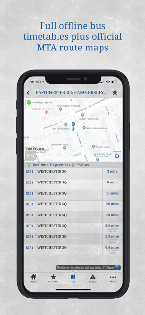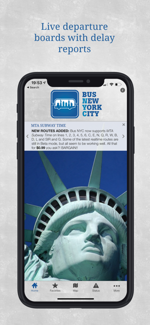 ** NEW ** Realtime Subway Departures powered by MTA Subway Time- just $0.99 as an in-app-add-on!BUS NYC IS THE MOST FEATURE RICH NEW YORK CITY BUS APP AVAILABLE, ENHANCED WITH MTA BUS TIME. *** Winner at the MTA AT&T App Quest Awards! *** Features: ################## * Find out when the next buses are scheduled to arrive. * With MTA Bus Time®, we can give you live departure info and bus positions for all MTA buses in New York. * **NEW** Realtime Subway departures for the 1, 2, 3, 4, 5, 6, L and S (42 St Shuttle), all for just $0.99! More realtime routes will be added as they become available.* View full bus timetables for a selected service even when you don't have an internet connection e.g. find out when the last bus is scheduled to leave. * View official MTA route maps for the Subway and the bus networks in Manhattan, Brooklyn, Queens, the Bronx & Staten Island. * Find out latest news that might affect your daily commute, as well as status updates for bus, subway, rail,