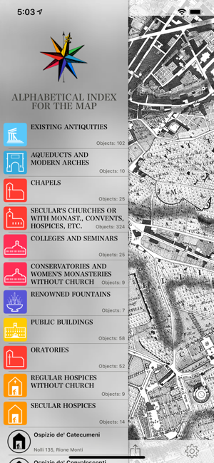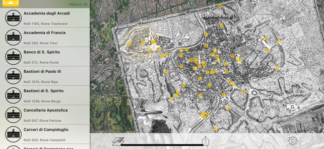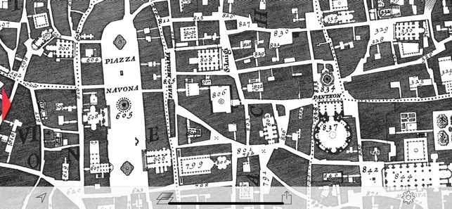 Nolli for iPhone and iPad brings one of the greatest maps of all time to your smartphone: the great plan of Rome by Giambattista Nolli, originally published in 1748. An app to discover the city from the inside and to surprise you. An app to both lose and find yourself in Rome.Navigate the Rome of today with this eternal map, that is surprisingly still very valid for the historical center. See more than others, enjoying the fine detail and clear handcrafted graphics of this masterpiece of mapping.Go into the right direction with this app and you will discover a lot of interesting things that might not have caught your attention using a different map.The app allows for using the map in high resolution, also offline without internet connection, in free browsing mode and in follow-me mode. All points of interest from the 2 original indices (alphabetical by category and spatial by number) have been georeferenced and are contained in the app (more than 1400) with their corresponding data (na