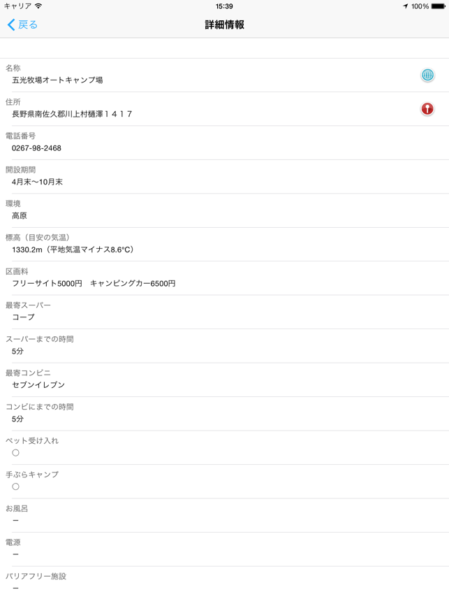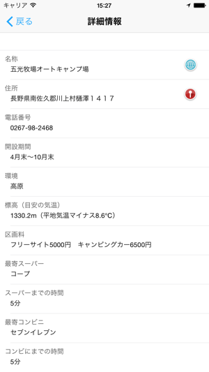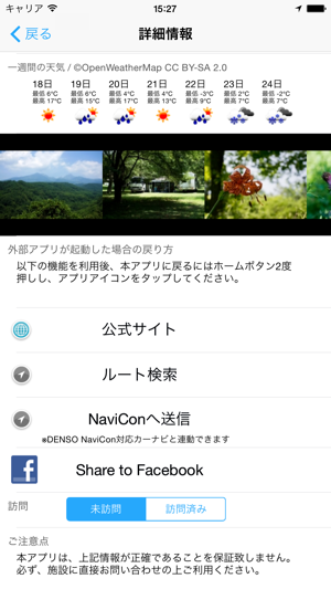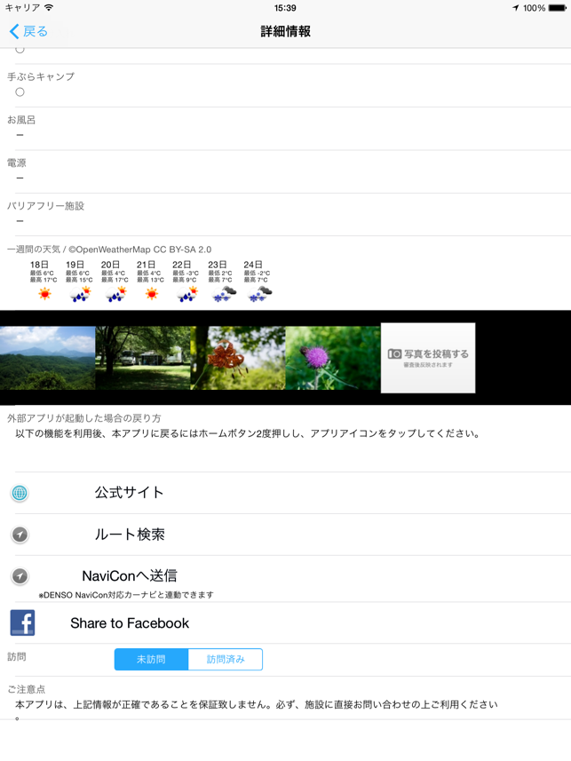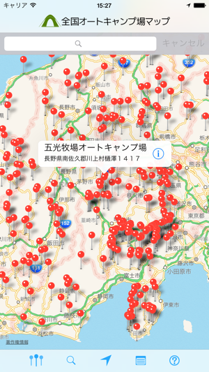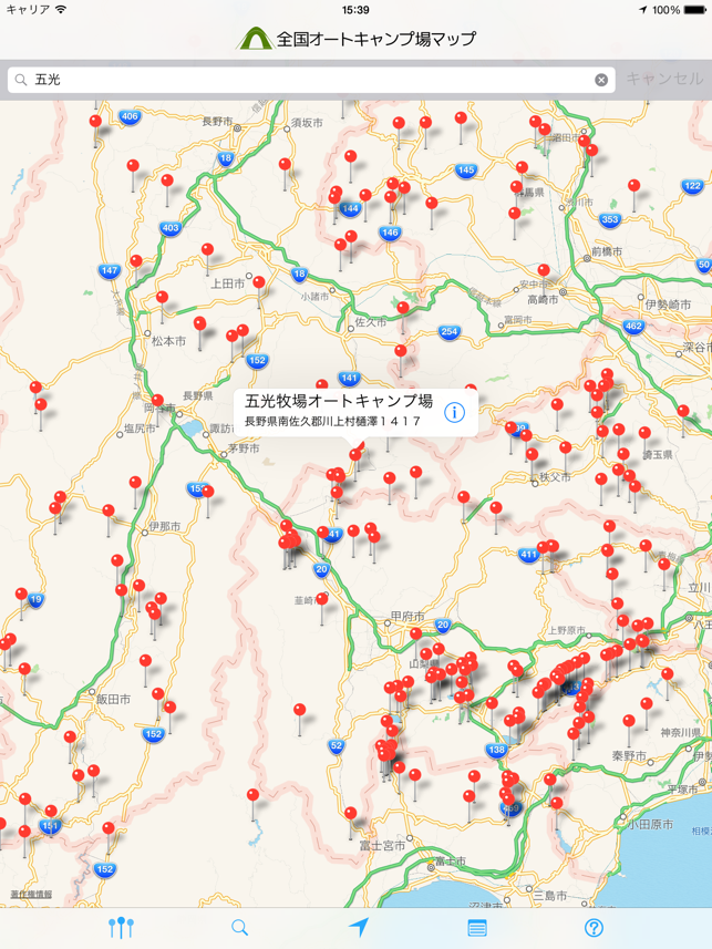 全国1,000ヶ所以上のオートキャンプ場を地図上に表示します。キャンピングカーでの利用や車中泊キャンプなどオートキャンプに適したキャンプ場マップアプリです。現在地周辺のオートキャンプ場を簡単な操作で探すことができ、キーワード、都道府県、施設条件から検索することもできます。 また表示したオートキャンプ場までのルート案内等も簡単に行う事が出来ます。 DENSO NaviCon対応カーナビへ目的地設定することもできます。 ※「全国車中泊マップ」と「全国オートキャンプ場マップ」が、DENSO SmartTech Award 2013ジャンル賞(ライフスタイル)を受賞しました!【主な機能】 ・iPhone5のワイド画面に対応・標高と気温の目安(平地との差)・写真(一部のキャンプ場)・Facebookシェア機能・地図上でオートキャンプ場位置の表示 ・近くのオートキャンプ場検索 ・現在地からオートキャンプ場までの距離表示・キーワード検索 ・都道府県から検索 ・ルート検索 (マップアプリとGoogleMap、Yahoo!カーナビを選択可能)・カーナビ連動機能(DENSO NaviCon対応カーナビのみ) ・オートキャンプ場の詳細情報 ・画面の縦横対応 ・Wifi/3Gなどのネットワークがない状態でも一部機能は利用できます(地図は表示できません) ・訪問の有無【掲載オートキャンプ場情報】 ・名前・電話番号・郵便番号・住所・都道府県・開設期間・定休日・営業時間(チェックイン、チェックアウト)・環境・標高(目安の気温)・周辺の一週間の天気予報(OpenWeatherMapを利用しています)・大人入場料・子供入場料・区画料金・公式ページURL・オートキャンプの台数・テント専用サイトの数・テントサイトの状況・標高・予約開始・WEB予約・開設年・キャンプ場の面積・最寄りのスーパー名称・最寄りのスーパーまでの時間・最寄りのコンビニまでの時間・キャンピングカー専用サイトの有無・キャンピングカー専用AC電源・キャンピングカーの給水設備・キャンピングカーの排水設備・5×2mのキャンピングカー・7×2mのキャンピングカー・トレーラーの受け入れ・ペットの受け入れ・デイキャンプ・お風呂・電源・バリアフリー施設・写真