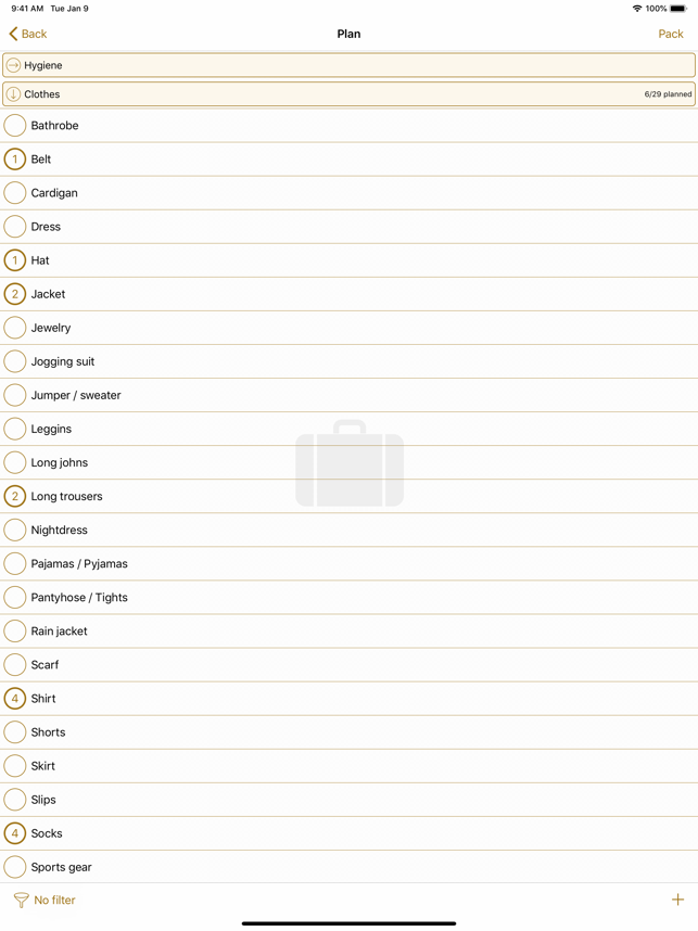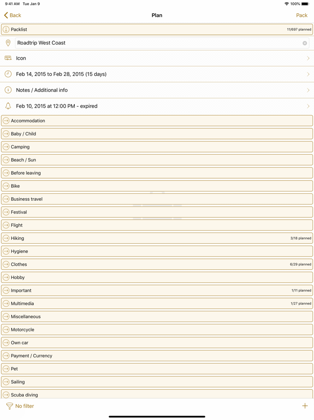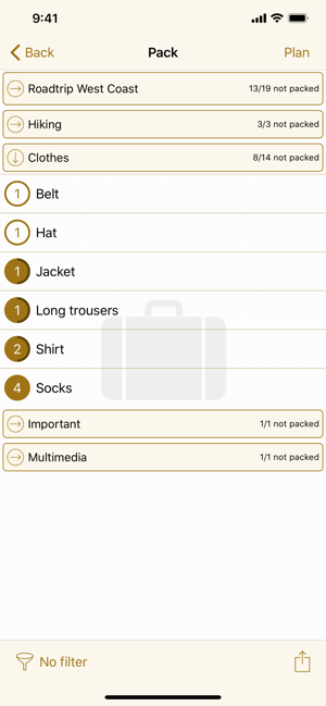 Have you ever forgotten something really important for your trip?This will never happen again with Pack The Bag!No more incomplete hand-written packlists for your upcoming journey, no more bad feelings or expensive surprises at the airport. Make your next trip the best trip ever.Pack The Bag for iOS helps you managing your packlists. You and your bag will be well-prepared, you will save the trouble of thinking about all the items that you want to carry along on your journey.Pro version: no ads, all features! Import your lists from Pack The Bag Free with only 2 clicks!- Choose from more than 700 items in 27 categories- Easily create, edit and delete items and categories- Maintain your items in the inventory list without the need to create a packlist- Assign a weight to your items to prevent expensive surprises at the airport- Create new packlists by copying from existing lists- Pack your items without running around by optionally sorting by storage locations- Send and share packlists by