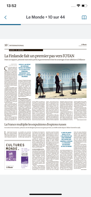 Retrouvez l’intégralité du journal papier accompagné du cahier quotidien Eco & Entreprises, ainsi que les cahiers hebdomadaires, les suppléments mensuels et des hors-séries.Le Monde à consulter partout :- L’édition du jour disponible dès 13 heures, heure de parution à Paris- La possibilité d’accéder aux 30 dernières éditions du journal- En avion ou dans le train, consultez les éditions chargées, même hors connexion…- Téléchargement anticipé : permet de commencer à lire le journal avant la fin du téléchargementUne navigation tactile et intuitive :- La mise en page est adaptée à l'écran de l'iPhone ou de l'iPad, pour un confort de lecture unique- Le mode déconnecté vous permet de profiter des contenus, même en avion- L'accès direct à M, le magazine du Monde, aux suppléments de votre journal ainsi qu'à des hors-séries.Abonnez-vous directement depuis l'application :- Téléchargez Le Monde en illimité sur votre iPhone/iPad- Abonnement mensuel à partir de 12,99 €-