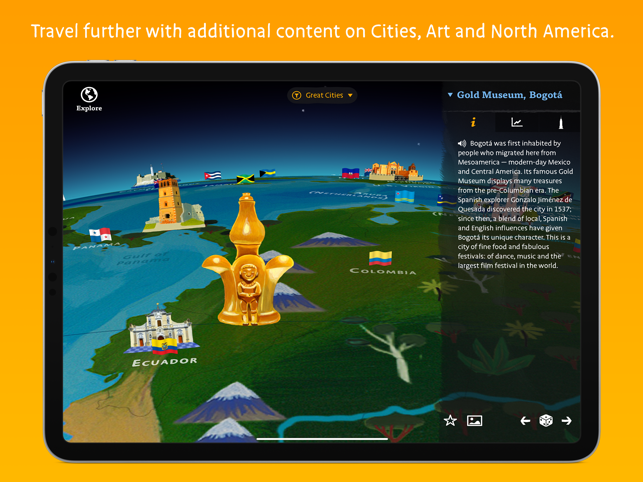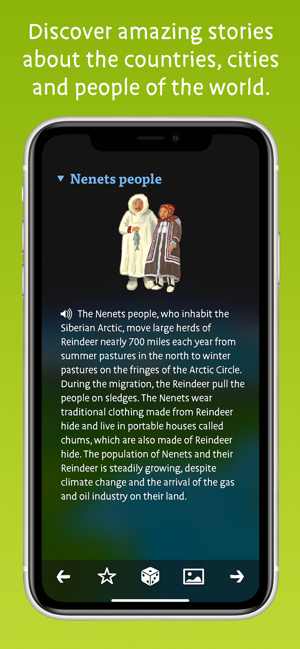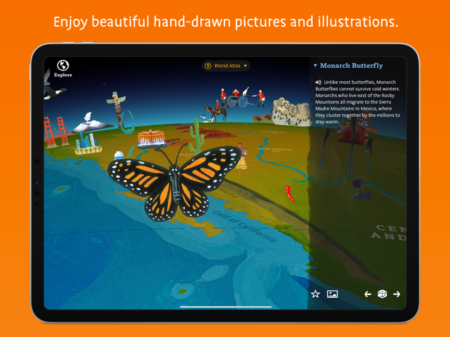 NEW EDITION! Fly around the interactive 3D globe and discover the rich wonders of our planet. Barefoot World Atlas show-stopping interactive app allows children to explore an enticing, spinning world packed with animated icons, an ever-changing soundscape and interactive quizzes. PRAISE FOR THE 2012 RELEASE“An immersive app that immediately invites exploration” – The New York TimesAn Apple Editor’s Choice Pick, App of the Week, and in the App Hall of Fame.Featured on NBC’s Today Show as a top education app Originally released in 2012, the newly updated World Atlas app dives deeper into world art, major cities and North America, and a new “surprise” option allows children to discover exciting new features and places on the globe just by shaking their device. With the new “favorites” mode children can personalize their world, providing a fun and interactive way to share their adventures with friends and family. FEATURES:A multi-language, universal app optimised for the retina displaySpin