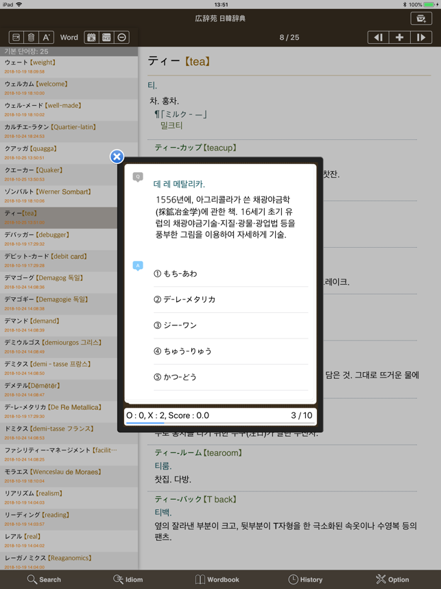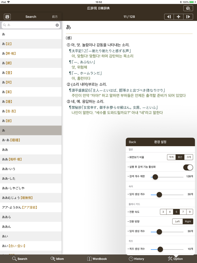 앱 스토어 최초! 일본의 국민 사전 일일 고지엔 사전이 일한 고지엔 사전으로 번역 출시!! 고지엔 일한 사전의 특징I. 서적일본 최고의 국어(일본어) 사전 고지엔 사전 6판(이와나미 출판사)이 일한 고지엔 사전으로 번역 출시되었습니다.일본에서 1100만 명에 가까운 독자를 확보한 국민적 사전인 고지엔 사전의 최신 개정 6판은 변화하는 일본어에 맞춰 내용을 개정하고, 각종 생활 지식에서 최신 시사, 경제 용어, 가타가나어, 외래어 등의 신어를 풍부하게 반영하여 수록하고 있습니다.메이지 시대 이후의 작품으로부터 1500여 용례를 새롭게 게재하고, 속담, 4자 성어도 보강, 수록되어 있습니다.일일 고지엔 사전 최신 개정 6판을 그대로 옮긴 일한 고지엔 사전은 일본어에 대한 가장 자연스런 일본어 뜻 풀이를 한국어로도 쉽게 학습 할 수 있도록 만들어졌습니다.II. Program1. 표제어 실시간 검색기능 지원2. 숙어(관용구) 실시간 검색기능 지원3. 다중 단어장 기능 지원4. 최근 검색어 History 기능 지원5. 플래시 카드 기능 지원6. 퀴즈 기능 지원7. 단어장 및 숙어장 백업 지원개발•판매: 다올소프트