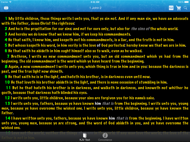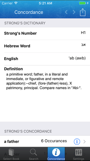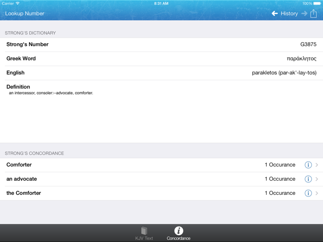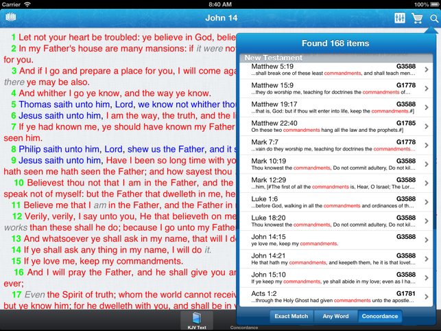 Strong's Concordance, is a concordance of the King James Bible (KJV) that was constructed under the direction of Dr. James Strong (1822–1894) and first published in 1890.A concordance lets the reader directly compare how the same word may be used else where in the Bible. In this way the Strong's Concordance provides an independent check against translations, and offers an opportunity for greater, and more technically accurate understanding of the Bible text.Want to see it in action before you buy? Try Strong's Concordance Lite which provides a 100% functional demo of Matthew and Genesis.This program does not require internet access, everything you need is all stored on the iDevice.Features:* Search for English words, and lookup Greek/Hebrew dictionaries.* Proper concordance, listing how the word was translated in other bible verses.* Full King James Text is included* Click on any blue word for concordance text.* Night mode for those that like to read at night (White on blac