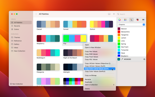Capture and collect color palettes with Pastel!Pastel is an app for amateur developers & artists (like us!) that lets you build up a library of color palettes to use in your projects.With drag & drop, drag colors out into other apps like Pages and Keynote, or many third-party apps from your favorite developers, so you can use your Pastel library as your master color collection across apps.Seamlessly sync your library across devices with iCloud.Analyze photos to determine their dominant colors — choosing specific colors manually if you wish — and save their color palettes to Pastel.Includes a variety of color pickers, like wheel, RGB sliders, and crayons, or pick named colors from your color library that you curate yourself. Drag and drop from the sidebar to any palette.Copy a variety of developer-focused code representations, like RGB, hex, Objective-C, Swift and SwiftUI. Paste hex codes into the sliders color picker.From the menu bar, bring up the color picker from wherever yo