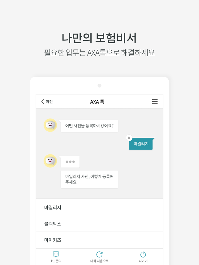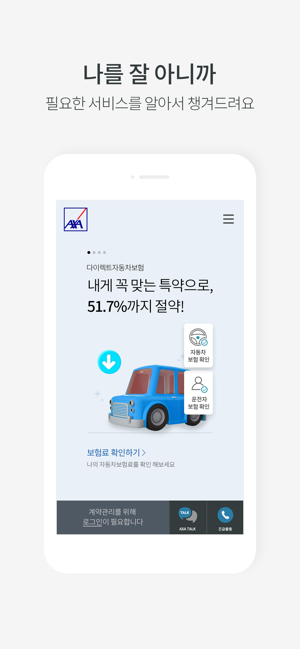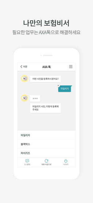 다이렉트 보험의 시작 AXA손해보험의 공식 어플리케이션 입니다.스마트폰으로 자동차보험, 운전자보험, 해외여행자보험의 저렴한 보험료를 확인+간편하게 가입하고 다양한 할인혜택까지 받아보세요.[ 모바일 보험료 확인/가입 가능 상품 안내 ]- 자동차보험- 운전자보험- 해외여행자보험[ 자세한 서비스 내용 ]- 계약조회 및 변경 ( 일부서비스는 PC에서만 제공 )- 간편한 사진 등록 서비스 ( 마일리지, 블랙박스 특약 가입 시 ): 계기판,블랙박스 사진, 자기차량손해 가입에 필요한 사진을 등록- 긴급출동 서비스: 자동차 긴급출동 서비스를 스마트폰으로 쉽게 - 사고접수 및 사고 처리과정 조회- 이벤트 참여, 혜택더모아 서비스[ 다이렉트보험 추가 설명 ]- 자동차보험* 마일리지 30.2% ~ 17.6% 특약할인 ( 개인용 후할인, 2천 ~9천km 이하 주행 시 )* 블랙박스 5% 특약할인* 3년 무사고 최대 13.2% 할인* 마이키즈 8% 특약할인 ( 만7세이하 자녀 )* 3049세 평균 6.2% 특약할인 ( 30세 한정특약대비/기명1인,부부한정 )* 인터넷 가입 4% 저렴!- 운전자보험* 교통사고에서 발생하는 상해사망후유장해부터 손해보장까지 (특약 가입 시)- 해외여행자보험* 해외 여행의 필수품, 모바일로 10% 저렴하게 가입[ 모바일 앱 서비스 관련 문의 ]- 전화번호 : 1566-9635※ 운영시간 : 평일 9시 ~ 18시 , 주말/공휴일 미운영