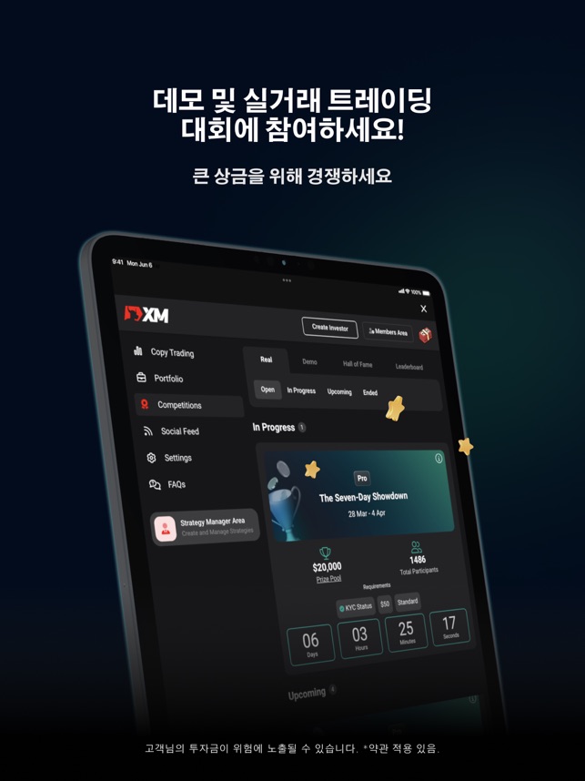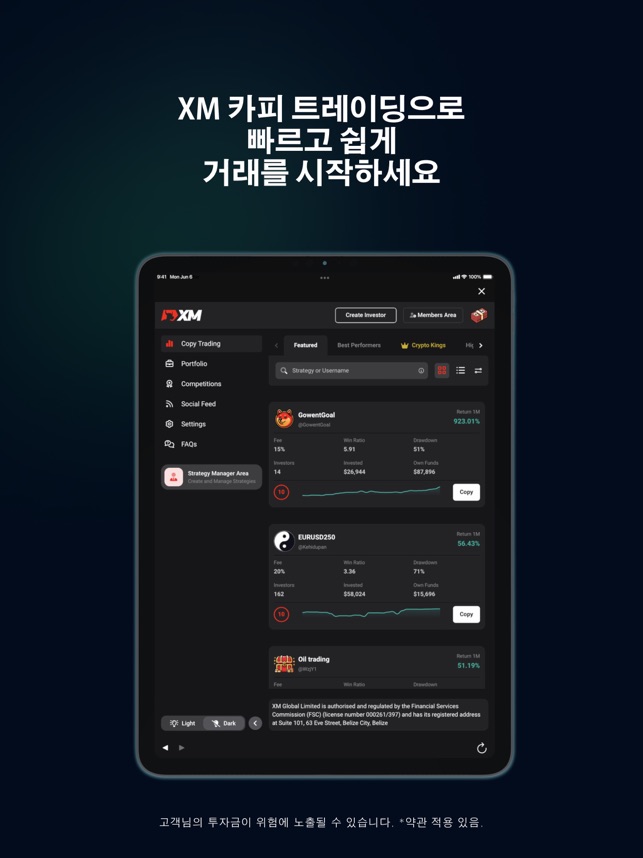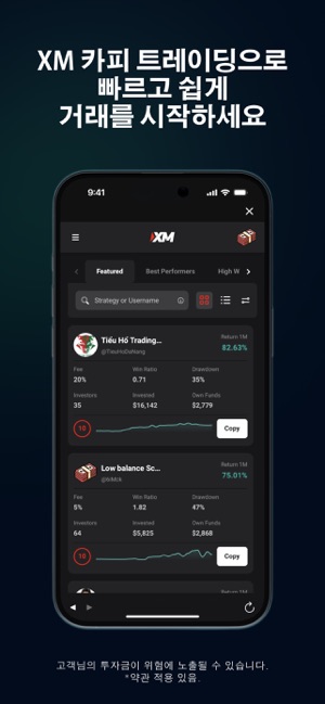 인기 주식과 글로벌 주가 지수를 혁신적인 사용자 친화적인 거래 플랫폼에서 거래하세요. 1,300개 이상의 다양한 자산을 탐색하거나, 오늘 무료 데모 계좌로 거래를 시도해보세요.제공되는 서비스주식 거래 및 그 이상• Amazon, Meta, Tesla와 같은 회사의 주식• Dow Jones, Nasdaq, S&P 500과 같은 주가지수• AI, 블록체인, 전기차 산업을 다루는 테마 지수 평생 무료 데모 계좌초보자는 자신의 돈을 위험에 빠뜨리지 않고 거의 실제 환경에서 거래를 연습할 수 있는 위험 없는 연습 계좌로 시장을 마스터하는 법을 배울 수 있습니다. 숙련된 거래자도 데모 계좌를 통해 실전에 앞서 전략을 테스트할 수 있습니다.열정적인 거래자들과 함께하는 카피 트레이딩경험 많은 전략 관리자를 카피하며 더 쉽게 수익을 창출하고 있는 100,000명 이상의 XM 거래자들과 함께하세요.• 무료로 가입하고 카피하세요• 4,000개 이상의 전략을 즉시 이용 가능• 원하는 만큼 전략을 카피하세요 – 제한이 없습니다!• 손절매 및 이익 실현 주문으로 통제하세요• 스마트 필터로 적합한 전략을 찾으세요• 수익이 발생하기 전까지 수수료는 없습니다 인출 가능한 상금이 있는 거래 트레이딩 대회데모 계좌 또는 실계좌로 큰 상금을 노려보세요. 당사의 트레이딩 대회는 경험과 상관없이 모든 거래자에게 열려 있습니다. 계좌에서 거래를 시작하기만 하면, 큰 상금을 얻을 기회가 있습니다!• 무료로 참가하세요• 큰 상금을 위한 경쟁• 거래 기술을 시험하세요• 다른 거래자들 사이에서 자신의 순위를 확인하세요무료 거래 교육 및 분석포괄적인 분석과 교육 자료로 거래 경험을 향상시키세요. 시장에서 우위를 점하고 정보를 유지하기 위해 다음을 제공합니다:• 일일 시장 뉴스• 독점 기술 분석 보고서• 최고 수준의 차트 도구• 실시간 거래 세션• 웨비나• Q&A 세션무료 거래 신호일일 신호에 가입하여 기술적 및 기본적 분석을 기반으로 잠재적인 시장 움직임에 대한 통찰력을 얻으세요. 최적의 진입