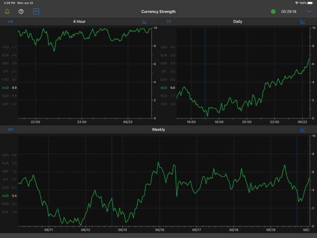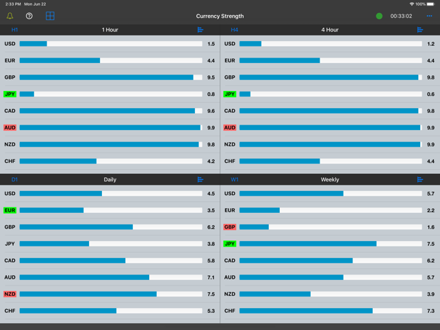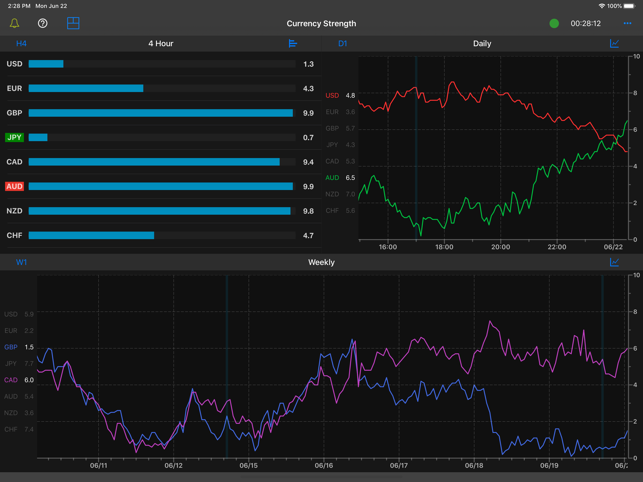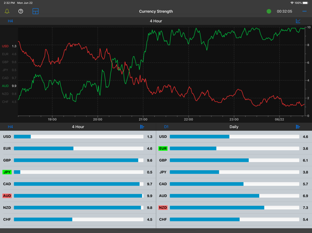 Improve your Forex trading with this full featured Currency Strength Meter.Fast, accurate currency strength data allows you to quickly scan the Forex market to find to best trade opportunities.Features include access to a dedicated currency strength data feed, bar charting, line charting, multiple time-frames plus much more.What is Currency Strength?Currency strength is a popular indicator used by Forex traders to make sense of price moves in the Forex market. It takes advantage of the price correlation between various Forex pairs. Currency strength is measured for 8 currencies (USD, JPY, EUR, GBP, AUD, NZD, CHF, CAD) and is reported on a scale of 0 (weakest) to 10 (strongest).It's calculated by performing real-time calculations on a large group of Forex pairs. It involves measurement of relative price moves over various sampling time-windows using our proprietary currency strength algorithm. All this heavy number crunching is done by our data servers in real-time, and delivered to