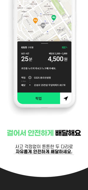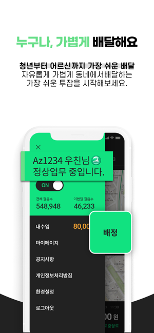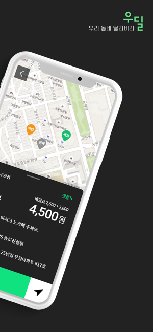 영상보기: https://youtu.be/ITVfbeOvVvI언제 어디서나 산책하며 돈 버는 즐거움, 우리동네 딜리버리 가까운 우리 동네 안에서 편의점, 슈퍼마켓 상품 등을 배달하는 배달 전용 플랫폼입니다. 별도의 장비 없이 성인이라면 누구나 배달에 참여할 수 있습니다.[이용방법]1. 앱을 실행하여 회원가입을 합니다. 2. 회원 가입 후 안내받은 사이트에서 안전교육을 수료합니다.3. 수행하고 싶은 오더를 선택하여 배정합니다.4. 상품 픽업지를 방문하여 상품을 픽업합니다.5. 배달지를 방문하여 상품을 문 앞에 두고 사진을 찍은 후 완료 버틀을 누릅니다. 6. 정산 받을 배달료는 정산 일정에 맞춰 정산됩니다. #누구나, 가볍게 배달해요 청년부터 어르신까지 가장 쉬운 배달 저중량 상품 위주로 배달하기 때문에 누구나 일하기 쉽습니다. 자유롭게 가볍게 동네에서 배달하는 가장 쉬운 투잡을 시작해 보세요#내가 원할 때만 배달해요내가 원하는 시간에 자유롭게 배달할 수 있습니다. 동네를 산책하듯 혹은 마트를 다녀오듯 빠르게 배달하고, 실속 있게 수입을 챙겨보세요#걸어서 안전하게 배달해요튼튼한 두 다리로 사고 걱정 없이자유롭게 안전하게 배달하세요자동차, 바이크 등 면허가 없어도 OK헬멧 등 무거운 장비가 없어도 OK배달 경험이 없어도 익숙한 우리동네니까 OK우딜 고객센터: 1577-3370 (10:00~ 23:00)카카오톡 플러스친구: 우리동네 딜리버리 (24시간 365일)우딜 홈페이지: http://woodel.co.kr