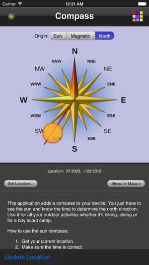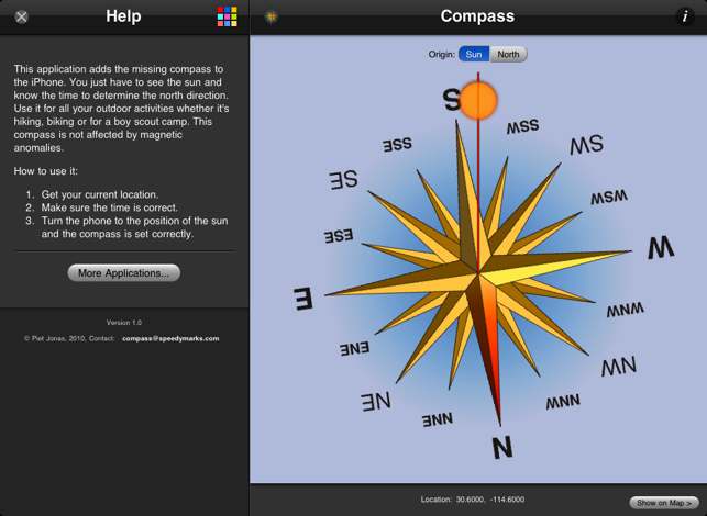 This application adds the a compass to your device. It either uses the built in magnetic compass (if available) or provides a sun compass (You just have to see the sun and know the time to determine the north direction). Use it for all your outdoor activities whether it's hiking, biking or for a boy scout camp. The sun compass is not affected by magnetic anomalies.