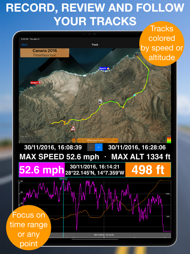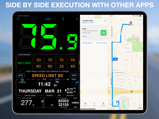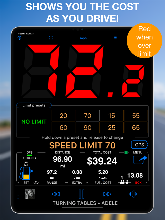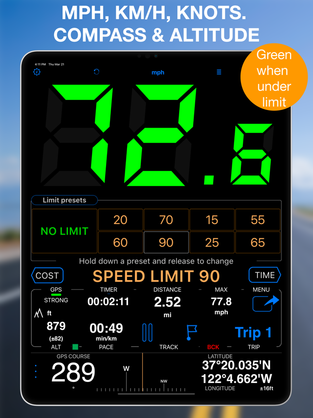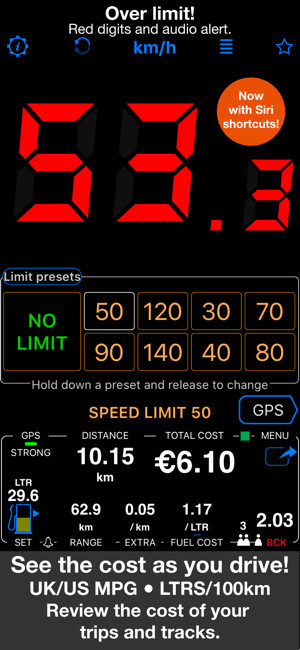 A high quality Speedometer, GPS tracker and trip cost monitor for iPhones and cellular iPads. ∙∙ When you go over a preset speed limit, the large digits change colour from green to red and the device emits a loud sound to alert you! ∙∙ The cost monitor shows you the current cost of the journey as you drive and tells you each passengers share. ∙∙ GPS tracker records your trips so they can be analyzed, viewed and shared at any moment.‣‣ COST MONITOR. What's the cost of my driving?Based on gas price for a gallon or litre, MPG (U.S. or UK) or liters per 100 km the app will show the cost as you drive. You can add an extra cost per kilometer or mile! Useful for all cost aware drivers and for splitting the cost between passengers.‣‣ GPS TRACKING. Where I've been? How long did it take to get from A to B? The app records your trip statistics even when GPS tracker is switched off. When you need point by point data to see on the map later or export (Google Earth, GPX, KML/KMZ), the app gi