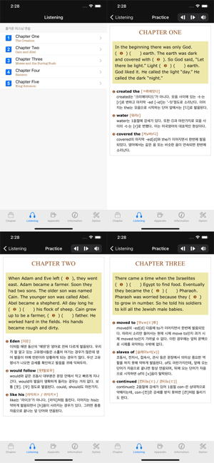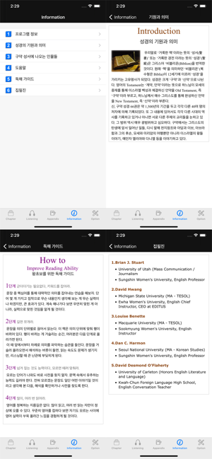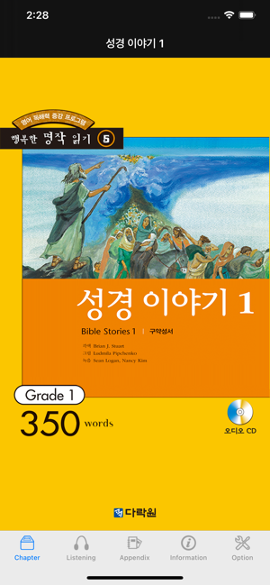 - 서적우리말로 ‘거룩한 책’이라는 뜻의 ‘성서’(聖書) 또는 ‘거룩한 경전’이라는 뜻의 ‘성경’(聖經)은 그리스어 ‘비블리온’(Biblion, 복수형)을 번역한 것이다. 원래 ‘책’을 의미하던 말인 ‘비블리온(복수형은 Biblia)이 12세기에 이르러 성경을 가리키는 고유명사가 되었다. 성경은 크게 ’구약‘과 ’신약‘으로 나뉜다. 영어의 Testament는 ’계약, 언약‘이라는 뜻으로 하느님이 모세의 중재를 통해 이스라엘 백성과 체결하신 언약을 Old Testament, 즉 ’구약‘이라 부르고, 하느님께서 예수 그리스도를 통해 완성하신 언약을 New Testament, 즉 ’신약‘이라 부른다. 구약에서는 그리스도의 탄생에 앞서 일어난 일들, 다시 말해 천지창조와 아담과 이브, 아브라함과 그의 후손, 모세와 미리암의 여행뿐만 아니라 이스라엘의 왕들 이야기, 예언자 엘리야와 다니엘 등을 이야기하고 있다. - 프로그램1. 수준에 따라 골라 읽는 재미가 있다. 초보자를 위한 350단어 수준에서 중고급자를 위한 1,000단어 수준까지 5단계 구성. 2. 영어의 맛과 멋을 읽는다. 이 프로그램은 단계별로 효과적인 영어 읽기 요령과 영문 고유의 참맛을 느낄 수 있는 장치가 곳곳에 포진. 3. 읽기만 해도 영어의 키가 쑥쑥 -- 영어표현 및 문법에 대한 친절한 설명, 어휘 학습과 매 페이지 펼쳐지는 멋진 그림들까지 어디 한군데도 소홀함 없다.4. 체계적인 듣기 학습까지. 여기에다 권말 특별부록 ‘리스닝 도우미’를 곁들여 읽기에서 그치지 않고 체계적인 듣기 학습까지 아우른다. 5. 전문 미국 성우들의 생동감 넘치는 원음을 포함하였다.개발•판매: 다올소프트