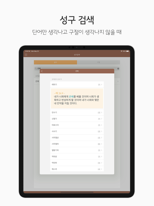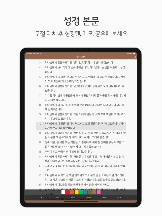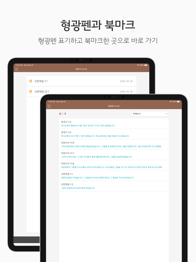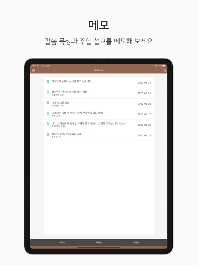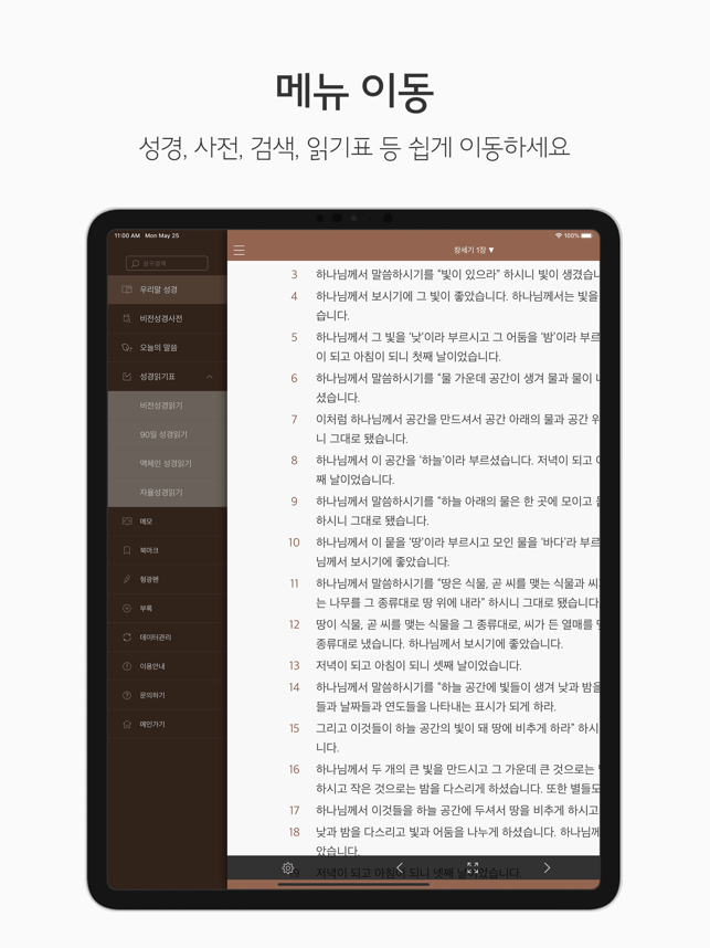 내 손안에 모바일 바이블, 우리말성경 & 비전성경사전 iPad 버전모바일 어플리케이션이 iPad버전이 출시되었습니다! (iPad. iOS 8.0 그 이상 버전에서 실행 가능)우리말성경 두란노가 11년동안 심혈을 기울여 번역한 가장 쉽고 정확한 원문 번역 성경입니다. 원문에 충실하면서도 구조적,언어적으로 정확하며 우리말 어법에 적합한 단어와 표현으로 번역되었습니다. 비전성경사전 설교준비,성경공부,가정예배,개인 큐티의 친절한 안내서로서 어려운 성경을 재미있게 설명해 주고 있습니다. †어플리케이션 구성 우리말성경, 비전성경사전, 맞춤형 성경읽기표, 성구/구절 검색, 매일매일 나에게 주시는 오늘의 말씀 365 수록 †주요기능 1 우리말성경 ① 성경 바로가기 ② 자동 스크롤 읽기 ③ 성경 북마크 ④ 성경구절 메모 ⑤ 성경구절 사전검색 2 비전성경사전 ① 성경에 나오는 단어 및 신학용어 검색 ② 65,000 여 단어 수록 ③ 읽기 쉬운 문체 3 맞춤형 성경읽기표 ① 비전성경읽기 ② 90일성경통독 ③ 맥체인성경읽기 ④ 자율성경읽기 4 성구/구절 검색 5 매일매일 나에게 주시는 오늘의 말씀 365 수록 †특징 및 부가기능 심플하고 편리한 UI/UX 빠르고 쉬운 검색 †저작권정보 우리말성경과 비전성경사전의 저작권은 두란노서원에 있음.V2.2 업그레이드 내용IOS7 대응왼쪽 슬라이드 메뉴 추가로 앱내 네비게이션 향상전체화면 터치 방법 변경 : 더블탭으로 변경(투터치)성경 선택 방법 변경 - 성경 보기에서 상단 타이틀 터치로 이동기타 버그수정v1.5 업그레이드 된 내용- 성경 읽기 1. 완료 된 처리 버그 수정 2. 90일 읽기 성경 날짜 없이 넘어가기 버그 수정 3. 완료 후 선택 화면으로 자동 변경 기능 추가 - 비전사전 1. 검색 된 히스토리 삭제 기능 추가 2. 색인 및 히스토리 기능 추가 3. 검색어가 아닌 검색 된 결를 저장하도록 기능 변경 . 검색 검색된 단어 삭제 기능 추가 . 디자인 본문 배경 이미지 변경 메인 화면 변경 성경 이미지 변경 . 이용가이드 환