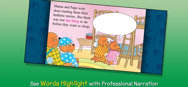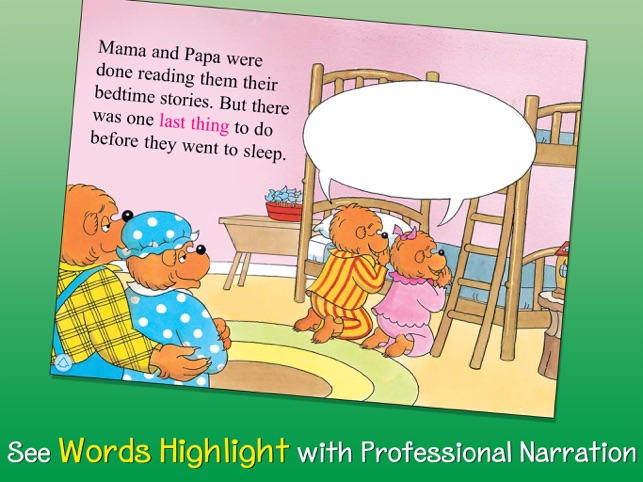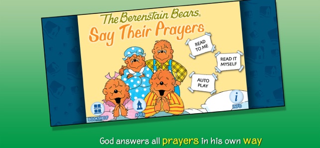 "Ask and it will be given to you; seek and you will find; knock and the door will be opened to you" —Matthew 7:7Join the Berenstain Bears in this interactive Christian book app as Brother Bear learns that praying isn't just for bedtime! Explore pictures, learn new vocabulary, and personalize the story with your own narration. Jump inside to find out how Brother learns that God answers every prayer in his own way and time.Part of the Living Lights series. Living Lights Berenstain Bear books help children learn how God wants them to live every day.Explore the Story:- ENCOURAGE literacy skills with highlighted narration- LEARN new words by tapping pictures- RECORD your own narration & share it with others- SELECT a scene with easy-to-use navigation- KEEP kids in the story with parental controlsDesigned for children ages 3-7------------------------------------------------------------------------The Reviews Are In:- "These apps tap into the best part of what technolog