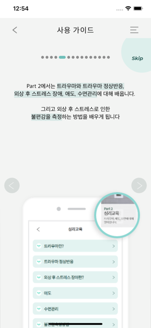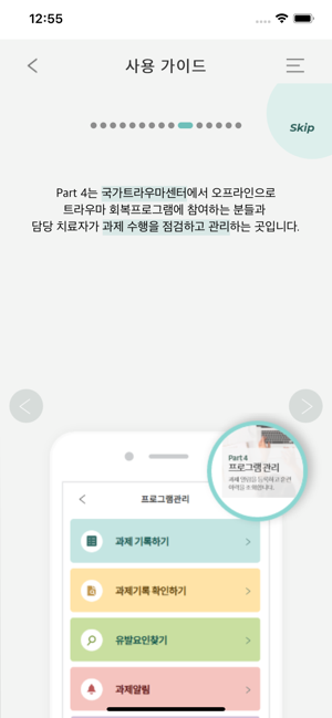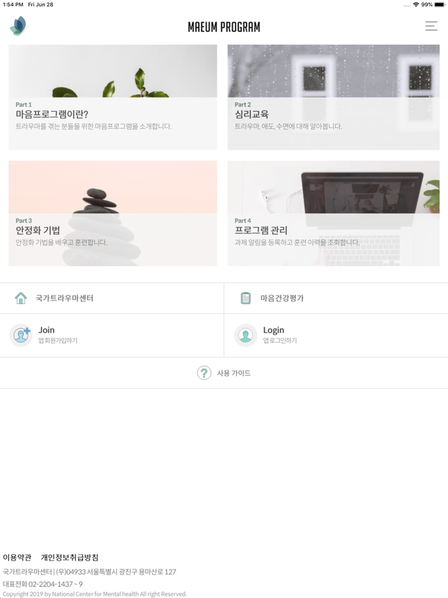 • 보건복지부 국가트라우마센터는 트라우마에 대한 교육과 안정화 기법으로 구성된 마음프로그램을 개발하였습니다. • 마음프로그램은 트라우마 치료의 입문 단계로, 스트레스 반응을 조절할 수 있는 안정화 기법을 배우고 훈련하여 심신의 안정을 돕는 프로그램입니다. 신체의 건강을 위해 꾸준히 운동을 하듯이 마음의 건강을 회복하기 위해서 마음프로그램을 꾸준히 연습하는 것이 중요합니다. • 마음프로그램 어플리케이션의 주요 기능 - 심리교육 : 트라우마, 애도, 수면에 대해 알아봅니다. - 안정화 기법 : 복식호흡훈련, 근육이완훈련, 안전지대, 호흡마음챙김명상, 착지연습, 자원강화, 빛줄기 기법, 바디스캔, 봉인연습 등 트라우마로 인한 불편감을 감소시키거나, 스스로를 조절하는데 도움이 되는 기법들을 배우고 훈련합니다. - 프로그램 관리 : 과제 알림 등록 및 훈련 이력을 조회할 수 있습니다. - 기타 : 국가트라우마센터 홈페이지 및 마음건강평가 연결• 개발자 : 보건복지부 국가트라우마센터• 어플리케이션 디자인 및 기술 개발 : ㈜에프앤아이• 약관에 관한 자세한 내용은 아래의 링크를 참조하세요. - 서비스 약관 - 개인정보취급방침