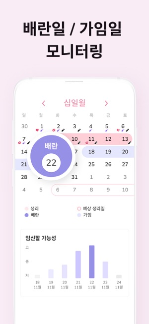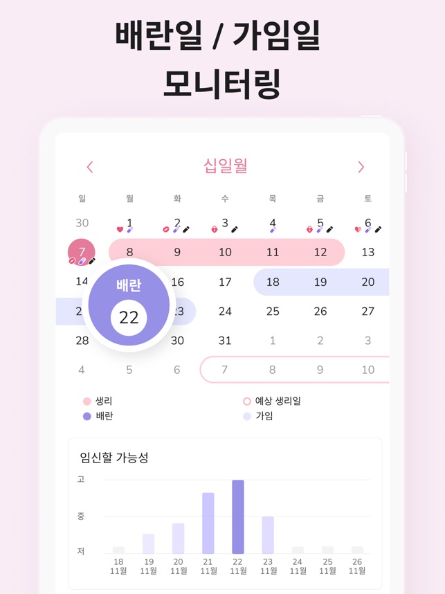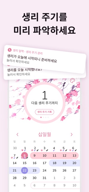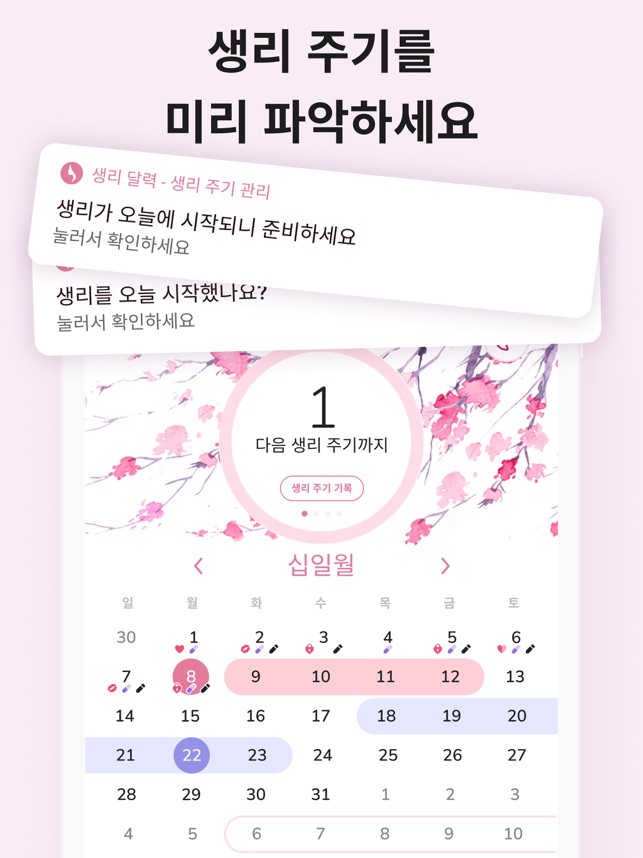 이 우아한 앱은 여성들이 생리 주기, 배란기, 임신 가능성이 높은(가임기) 예정일을 예측할 수 있도록 도와줍니다. 그래서 임신과 피임을 걱정하는 여성들에게 훌륭한 앱입니다. 또한, 생리 주기가 얼마나 규칙적인지 또는 불규칙적인지도 확인하실 수 있습니다.사용하기 쉬우면서도 많은 기능을 가지고 있습니다. 불규칙한 생리 주기, 몸무게, 체온, 기분, 혈류, 증상 등을 관리하실 수 있으며, 가임기, 배란기, 생리 기간을 예측하는 데에 있어서 훌륭합니다. 이 앱에 자신의 생리 주기를 기록하여 알고 싶은 주기일을 정확하게 예측해보세요.생리 기간이니 준비하세요:- 휴식 및 일에 대한 계획 세우기- 건강에 대해 자신감을 가지세요. 앱에 정보를 추가하고 이를 사용하여 의사의 질문에 답변하세요.- 증상을 메모하여 한눈에 확인하세요. 차트를 활용하여 변경 내용을 추적하세요.- 배란일 및 가임일을 추적하세요. - 핀코드나 face-ID, 지문으로 데이터를 계속해서 안전하게 관리하세요.- 약을 제시간에 복용하세요. 알림을 활용하여 약 복용 시간을 놓치지 마세요.달력이 있는 첫 화면에서 원하시는 모든 정보를 바로 확인하실 수 있습니다.이 달력 앱은 누군가 호기심으로 귀하의 민감한 정보를 보지 못하도록 사용자가 설정한 비밀번호로 잠겨있기 때문에 보안이나 개인 정보가 담긴 자료에 대해 걱정하실 필요가 없습니다. 게다가, 자신의 모든 데이터를 백업하고 복원할 수 있는 기능을 제공합니다.이 앱의 정확한 미리 알림을 사용하시면 향후 주기, 가임기, 배란기를 예측하는데 좋습니다.주요 기능:- 비가임기, 가임기, 배란기, 예정일, 생리 기간을 알려주는 직관적인 달력- 생리 기간 관리기, 계산기, 달력- 달력, 주기, 설정을 위한 백업 및 복원 기능. 실수로 달력에 있는 데이터 전부를 잃는 걱정을 하실 필요가 없습니다- 필수 요약 정보를 한눈에 볼 수 있는 직관적인 사용자 인터페이스- 알아두셔야 하는 사항- 다음과 같은 정보를 저장할 수 있는 입력기능: 생리양, 관계일, 증상, 체온, 몸무게, 약,