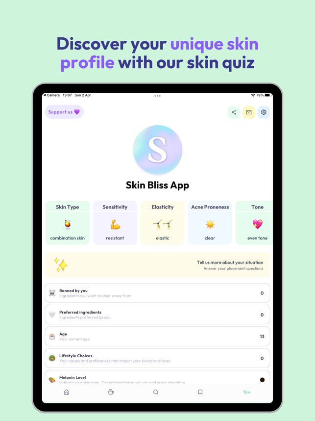 #1 SKINCARE APP IN THE WORLDAt Skin Bliss, we recognize that everyone’s skin is unique. We have empowered millions of people to discover their unique skin profiles and find the right skincare product matches to achieve optimal skin health. Gain personalized insights into your skin's changes and receive guidance and accountability along the way.SCIENCE-FIRST APPROACHRooted in AI, scientific research and supported by world-class skincare experts, researchers, and scientists, the Skin Bliss app is the most extensive skincare intelligence app ever created. Whether you have acne, dryness, wrinkles, oily skin, eczema, or any other skin concerns, it identifies the best ingredients and matches you with a product formulation that’s safe and effective for your skin profile.KEY FEATURES- FACE SCANNER—YOUR SKIN ANALYZED—Discover your unique skin profile and receive real-time analysis and personalized "Skinsights" with just a snap of your face.- PRODUCT COMPATIBILITY - Unsure if your