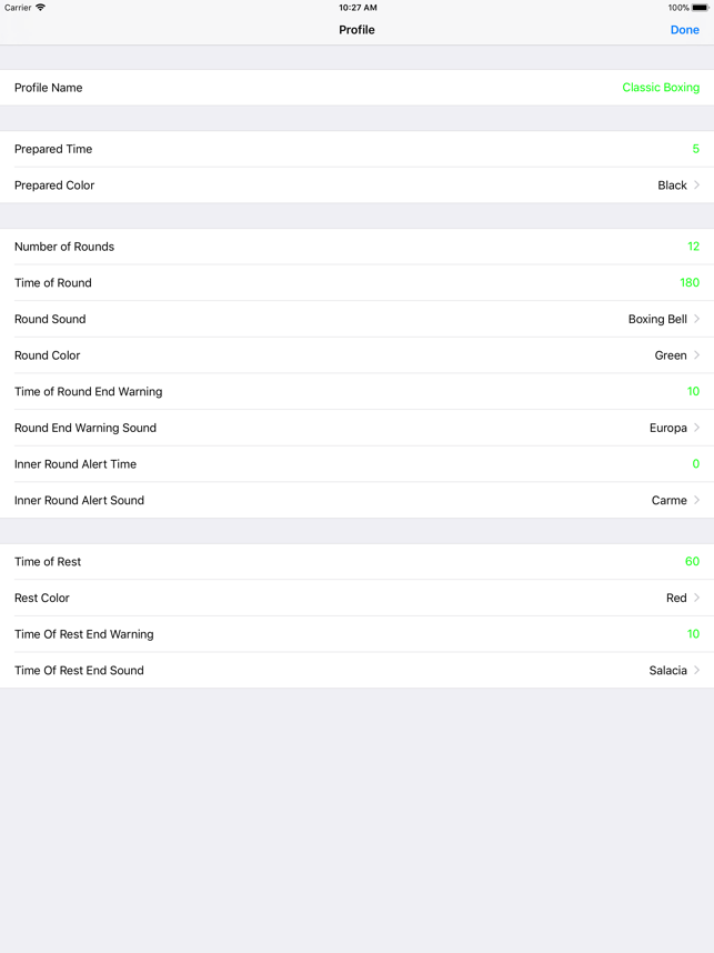 Boxing, MMA, Muay Thai, Kick Boxing, CrossFit & HIIT Round TimerBoxing Interval Timer is a round timer designed for training in any round sport such as Boxing Martial Arts, Wrestling, Mixed Martial Arts (MMA), Muay Thai, Kick Boxing, BJJ, or for any other round timer needs. It’s simple, modern and effective and works well also for HIIT trainings like TABATA, CrossFit.FEATURES:* Fully configurable sounds & times* Set times & sounds for preparation, round, warning, and rest* Inner round alerts* Color indication of phase* Blinking to alert warning* Screen stays on automatically* Works with screen on, or off * Multiple profiles to select* Create custom profile for different sports* Can be used for TABATA, CrossFit and other HIIT exercises* Easy to useUse the timer for when exercising in the gym, running, doing bodyweight exercises, sprints, high-low intensity cycling, boxing, MMA or other martial arts. Even though it says Boxing Interval Timer, you can use it for your TABATA, H