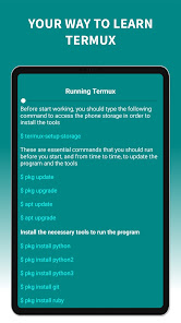 Learn Termux tutorials are designed to help you learn Termux from setting up the program and typing commands to using many of its tools The app explains the functions of the tools and how they can be installed and used in addition to many code examples to help you on your learning journey
