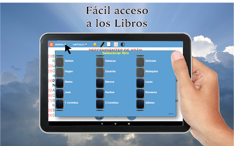 Usted puede hacer clic en la pantalla y la en la parte inferior aparecer el nombre de libro y el captulo al presionarla aparecer el listado de los libros y en la otra los captulos que posee el libro seleccionado