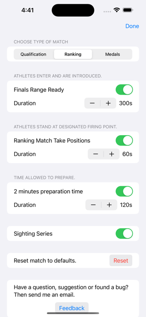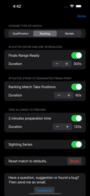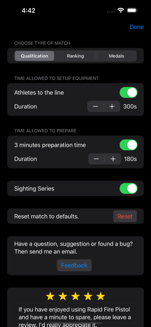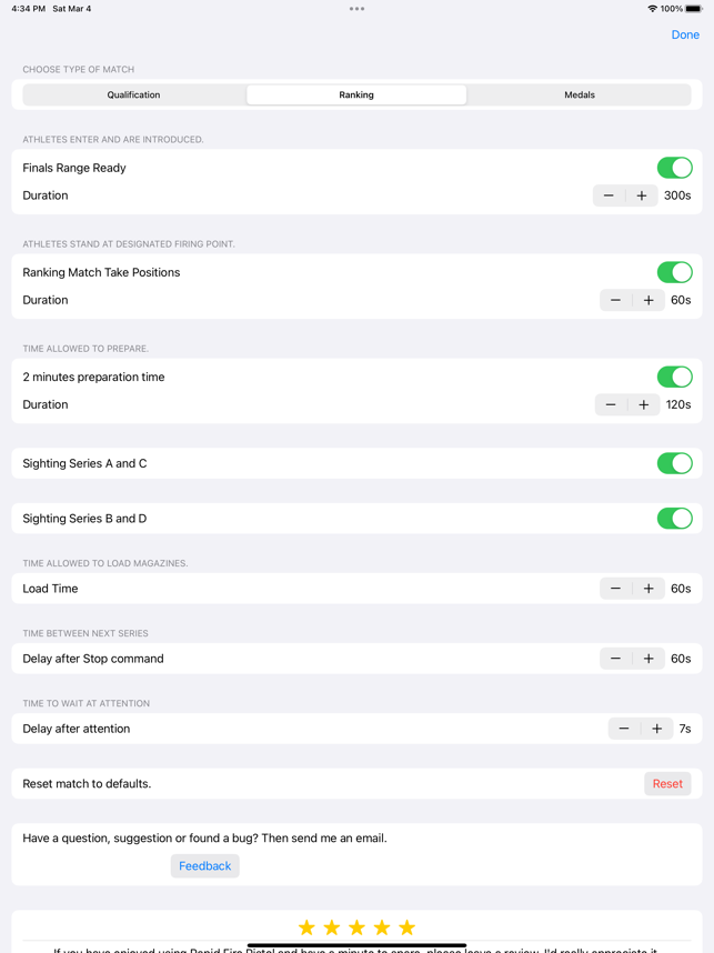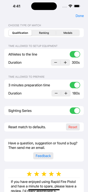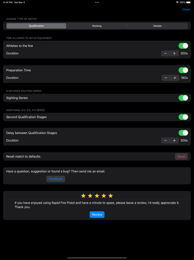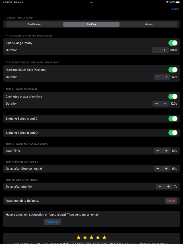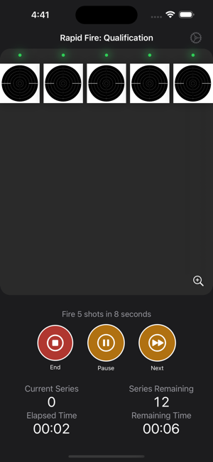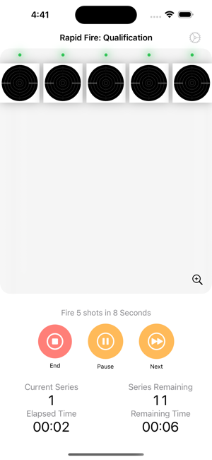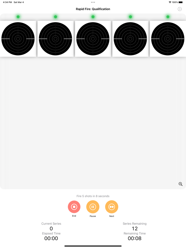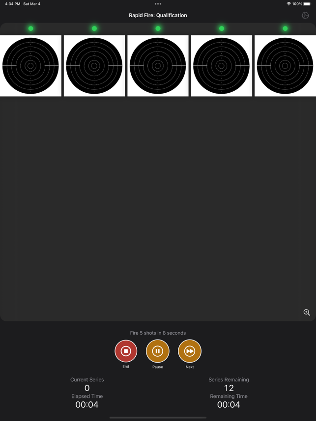 *** UPDATED TO LATEST ISSF RULES ***Rapid Fire Pistol the Target Shooting Training application, enables you to train specifically for 25m Rapid Fire Pistol (ISSF) competition, recreating the exact format including all of the necessary Audio prompts. Select from Qualification, Ranking, Or Medals match to start taking part in your own competition.The competition can be "PAUSED" at any time. Each of the stages are clearly displayed on screen, so that you don't lose track of where you are in the competition. Rapid Fire Pistol lets you concentrate on improving your performance, without the worry of timing your competitions. Features include: * Audio prompts played for each stage of the Competition * Qualification Stages* Ranking Stages* Finals Medal Match* Turn Sighting time on/off Manually move onto the next shot if you do not want to wait the full series time. Reset Settings to Standard ISSF Rules.