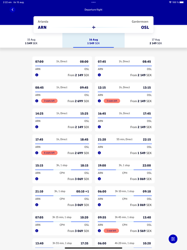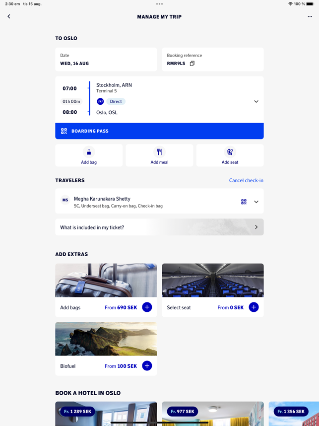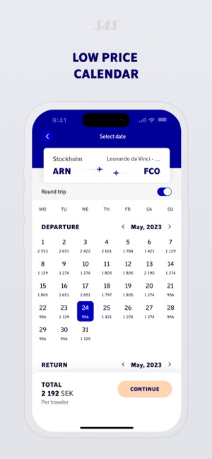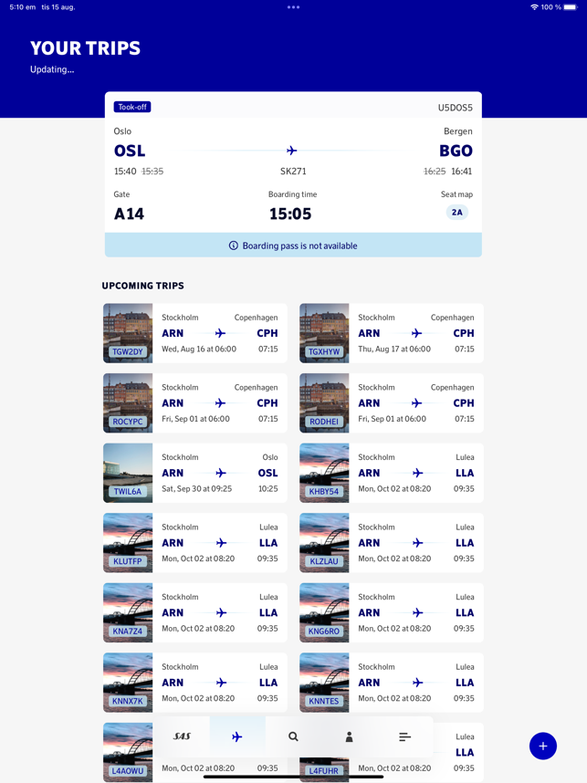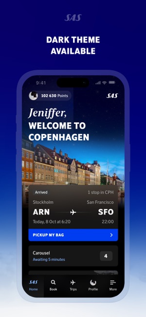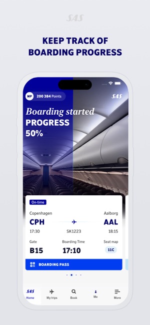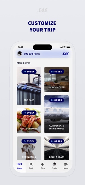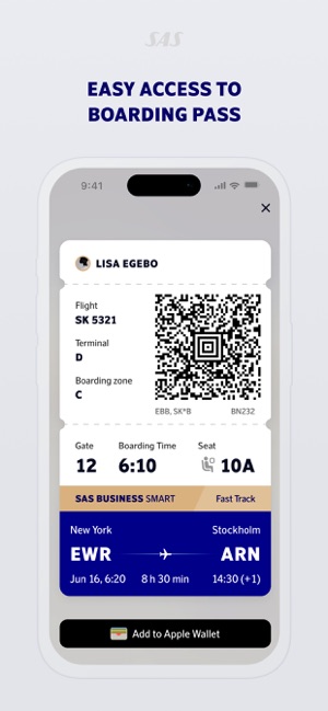 Check in from the comfort of your home and get your boarding pass on your phone for easy access, even when you don't have wifi. Journeys that matter with Scandinavian AirlinesAPP FEATURES• Manage your booking• Change it if you need to and get flight updates sent to your phone. • Enjoy quick access to all details of your trip. • Keep track on your checked-in luggage• Add extras to make your travel even better – inflight meals, extra bags, lounge access and upgrades to a more comfortable travel class are just a few clicks away. Easy check-in• Check in from 22 hours before departure. • Get your digital boarding card instantly and add it to Apple Wallet.• Choose your favorite seat.• Save your passport information for a smoother experience. For EuroBonus members• Access your digital EuroBonus membership card.• See your point saldo. ENTERTAINMENT• From 22 hours before departure, you can read newspapers, magazines and books in the app in several languages, free of charge. SUSTAINABILITY•