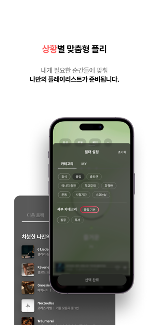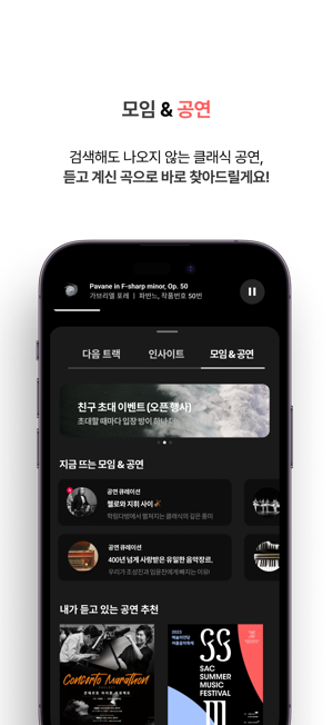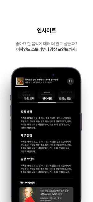 "클래식, 분위기를 디자인하다"상황&감정 기반 클래식 음악 추천 SR을 통해 분위기를 제안받아 보세요!공간에 어울리는 소리가 필요하신가요? 내 클래식 취향을 찾고 싶으신가요? SR (Sound Recommendation) 이 내게 어울리는 음향을 제안해드릴게요- 취향&분위기 : 나를 알아주는 오래된 친구오랜 친구가 좋은 이유는, 말하지 않아도 내 마음을 알아줘서가 아닐까요? SR 클래식은 사용시간이 늘어날수록 내 음악취향과 시간, MBTI를 고려해 더 정교하게 추천해요!- 상황 : 지금 이 순간을 함께하는 것처럼모닝페이지 (아침일기), 산책, 요리, 요가, 자기계발, 여행과 같이, 내게 필요한 모든 상황에 어울리는 클래식 플레이리스트를 터치 한번으로 불러와요.- 감정 : 내 마음을 어떻게 알았어?살다보면 위로 받고 싶을때가 있죠. 옆에 앉아 아무말 없이 음악을 틀어주는 연인같은 친구가 되어드릴게요. 휠을 돌려 내 감정을 골라주세요.- 몰입&집중&디지털 디톡스내 상황에 방해되지 않는 클래식 음악을 통해 더 몰입하고 집중할 수 있어요.음악을 켜두고 핸드폰과 잠시 멀어져보세요- 인사이트 : 내 취향에 대해 더 알고 싶을때추천받은 음악에 대해 더 알고 싶으신가요?SR은 음악의 비하인드 스토리부터 감상방법까지 함께 알려드려요. 내 취향으로 추천받은 클래식의 숨겨진 히스토리를 가족과 친구들에게 얘기해보세요!- 모임&공연 : 실제 연주가 궁금할때복잡한 클래식 공연 찾기도 해결해드릴게요곡 이름으로 검색해도 나오지 않는 연관 공연 때문에 답답하셨죠? 듣고 있는 곡 기반으로 취향에 맞는 공연을 한번에 찾아드려요!- 즐겨찾기 : 복잡함 없이 간편하게터치 한번으로 안되면 답답해요. 메인 화면에서 내가 즐겨찾기 해둔 플리를 한번에 실행해요! 플리 추가도 수정도 간편해야 해요 :)- 기능 업데이트리뷰를 통해 사용하고 싶은 기능을 남겨주세요! 지속적으로 업데이트 됩니다. (현재, 재즈 & ASMR 음원을 업데이트 중입니다) ■