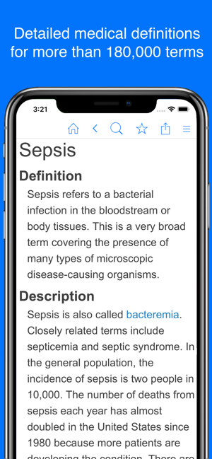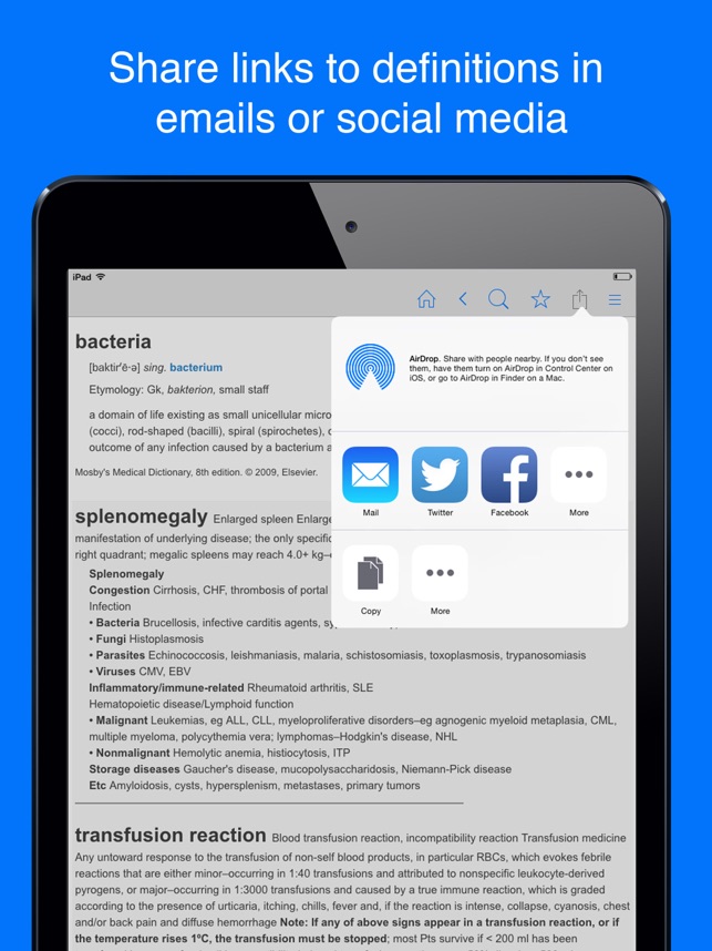 Medical Dictionary - Healthcare Definitions and Terminology is a free, iOS medical dictionary app that gives you instant access to more than 180,000 medical terms, over 50,000 audio pronunciations, and 12,000 images, all from authoritative sources, including McGraw-Hill, Houghton Mifflin, Gale, Elsevier, and more.Whether you’re a practicing physician, nurse, med student or just plain curious, this free medical dictionary app can help you find clear, in-depth definitions of medical terminology right on your iPhone or iPad. Search from across multiple disciplines - Our medical dictionary app compiles more than a dozen medical dictionary and encyclopedia sources, and includes entries on: AnatomyPhysiologyDentistryDiseasesDrugsNursingOphthalmologyPathologyTreatmentsTests and proceduresMedical research topicsAlternative Medicine+ much more…FEATURES:* Search 180,000+ medical terms and definitions.* Access over 40,000 entries available anytime offline. * Browse 1,000s of medical abbreviations