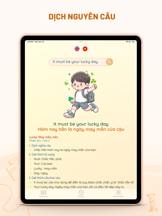 Từ Điển Anh-Việt AIĐược hỗ trợ bởi công nghệ AI luyện riêng cho việc làm từ điển, ứng dụng Từ Điển Anh-Việt mang đến trải nghiệm tra cứu từ vựng hoàn hảo. Với vốn từ không giới hạn, bạn có thể tìm thấy định nghĩa cho bất kỳ từ nào tồn tại, từ đơn giản đến phức tạp nhất.**Tính năng nổi bật:**- AI chuyên biệt: Ứng dụng sử dụng AI được đào tạo riêng cho mục đích từ điển, mang lại độ chính xác và hiệu quả vượt trội.- Vốn từ không giới hạn:Đưa ra định nghĩa cho mọi từ mà bạn tìm kiếm, không còn lo lắng về việc thiếu từ.- Chia động từ và danh từ: Phân tích và cung cấp các dạng của động từ, danh từ kèm theo ví dụ cụ thể cho từng dạng.- Dịch và phân tích câu: Dịch nguyên câu và phân tích ngữ pháp chi tiết, giúp bạn hiểu sâu hơn về cách sử dụng từ trong ngữ cảnh thực tế.Từ Điển Anh-Việt AI là người bạn đồng hành lý tưởng cho việc học tiếng Anh, hỗ trợ bạn mỗi ngày trong việc phát triển vốn từ và ngữ pháp. Tải ngay để trải nghiệm sức mạnh của AI trong việc học ngôn ngữ!