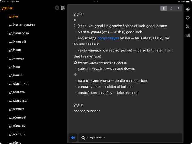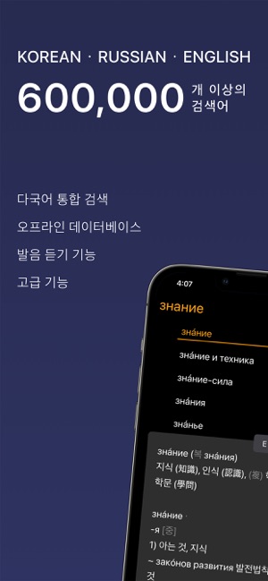 딱 필요했던 사전이네요~ 돈 주고 살 만합니다 (미미융)드디오 찾았다 여기는 말이 필요없죠. 이젠 일때문에 언어는 3가지 필해서 자꾸 사용 하게 됐어요. (iisenia)인터페이스도 깔끔해졌고. 영어까지. 일부 단어랑은 차이가 있지만 이 사전을 몇년째 쓰고 있는데 괜찮아요. 가격도 좋고요 (깨교)멀티 다국어 사전이 드디어 출시되었습니다!18개 오프라인 사전 데이터베이스를 한국어, 영어, 러시아어로 한번에 찾아보실 수 있습니다. KoRuEn Dic 고유의 유저인터페이스는 사전에 필요한 모든 기능(발음, 검색어 추천, 하이퍼링크, 북마크, 암기 카드)을 직관적이고 편리하게 사용할 수 있도록 디자인되었습니다. 주요 기능- 600,000 검색어 제공: 233,000+ 영어, 175,000+ 러시아어, 198,000+ 한국어 표제어.- 철자가 틀린 단어에 대한 제안이 포함된 통합 검색.- 각 언어에 대한 완벽한 설명이 있는 동의어 사전.- 사전 간 빠른 전환: 카드를 좌우로 스와이프하여 설명 언어를 변경할 수 있습니다.- 표제어 및 선택한 텍스트의 발음을 들을 수 있는 기능: 모든 언어의 발음을 들 수 있습니다. - 일반적으로 사용되는 각 단어의 다양한 사용 예시.- 한자 문자도 검색할 수 있습니다. - 언어 학습자를 위한 책갈피 및 플래시 카드 퀴즈.- 독특하지만 직관적이고 미니멀한 인터페이스- 하이퍼링크 콘텐츠: 단어를 탭하여 발음을 듣거나 의미를 확인할 수 있습니다.- iPhone, iPad 및 M1 Mac에서 작동합니다.- 오프라인, 광고 없는 경험.