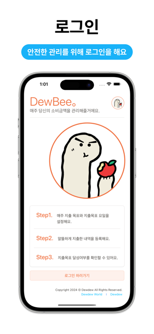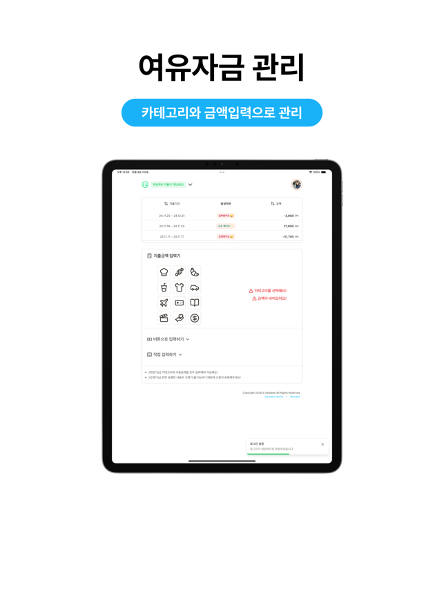 복잡한 가계부는 버려라!일주일간 목표한 여유자금만 관리해도 돈이 모인다!---안녕하세요! 똑똑한 여유자금 가계부 듀비 입니다.듀비는 아래와 같은 기능을 제공해 드려요!- 일주일간 사용할 예정인 여유자금을 설정하여 지출관리- 12개의 간단한 지출카테고리- 간단한 버튼으로 지출금액 선택- 4주간 지출성공여부 메인에서 확인- 지출 통계 (실시간,일간,주간, 통계표) 확인- 관리자와의 문의채팅 사용가능---더욱 많은 기능은 계속적으로 추가될 예정이에요!===v1.3 개선사항- 스크린샷 변경 (아이폰, 아이패드)